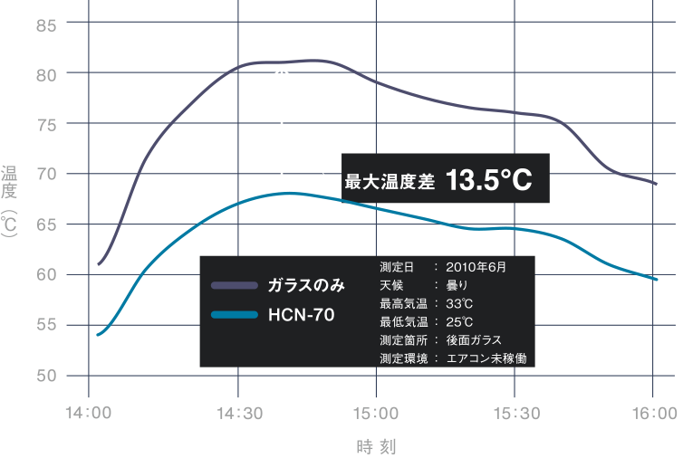 Premium seriesは、WINCOSの中で最も優れた遮熱性能を持ち、夏場の鋭い日差しで肌に感じるジリジリ感を強力にカットします。独自のIR(赤外線)コーティング※により、ガラス単体に比べ夏場のピーク時における車内の温度差は最大で13.5度ありました。