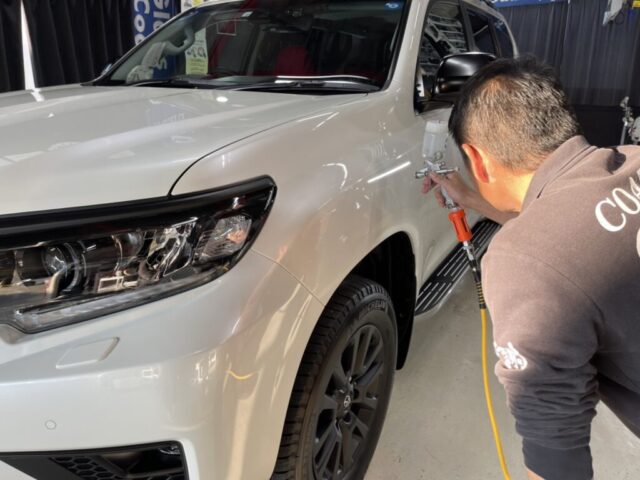 愛媛県西条市よりご来店のオーナー様、トヨタプラドTRJ150W ガラスコーティングゴールド2層コーティング施工
