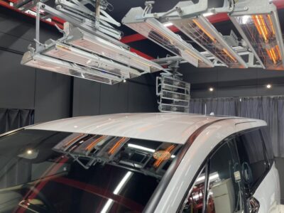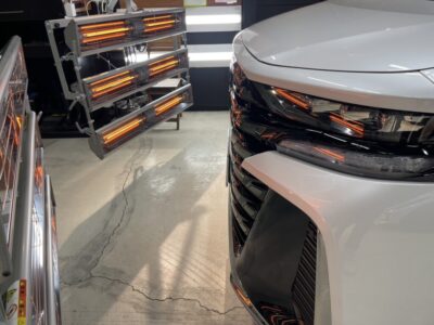 実は、コーティングの質と持続力を大きく左右するのが“硬化の仕方”。そして、その硬化においてプロ専門店ならではの遠赤外線ヒーターが、仕上がりに圧倒的な差を生みます。遠赤外線ヒーターは、ボディ表面だけでなく、塗膜の深部までしっかりと加熱できる特殊な機器です。