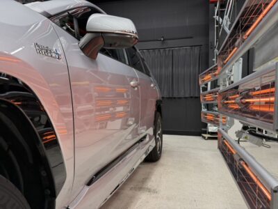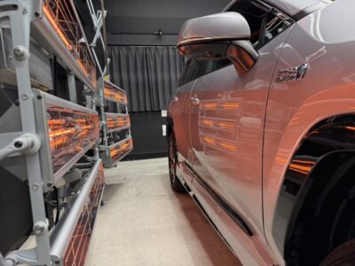 洗浄には純水設備を用いて、塗装に不要な成分を残さず下地を整えます。研磨では高輝度LEDと専用機材で微細な乱れまで補正し、施工は塵や湿度を排除した空間で実施。