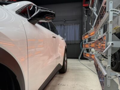 洗浄には純水設備を用いて、塗装に不要な成分を残さず下地を整えます。研磨では高輝度LEDと専用機材で微細な乱れまで補正し、施工は塵や湿度を排除した空間で実施。
