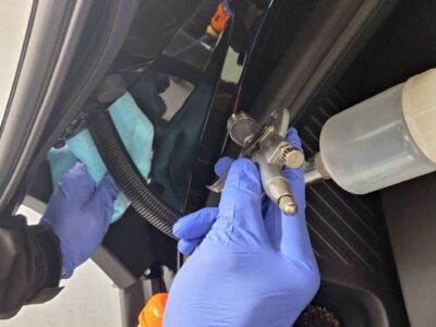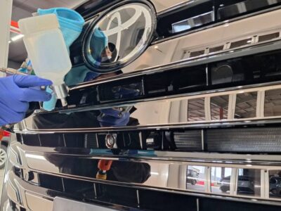 ここまでの作業で最適なボディ状態に仕上げたうえでコーティング剤を塗布していく流れとなります。グリルは塗り込みが難しいためスプレーにて吹付け仕上げていきます。最後に細部までチェックを行い納車する流れとなります。